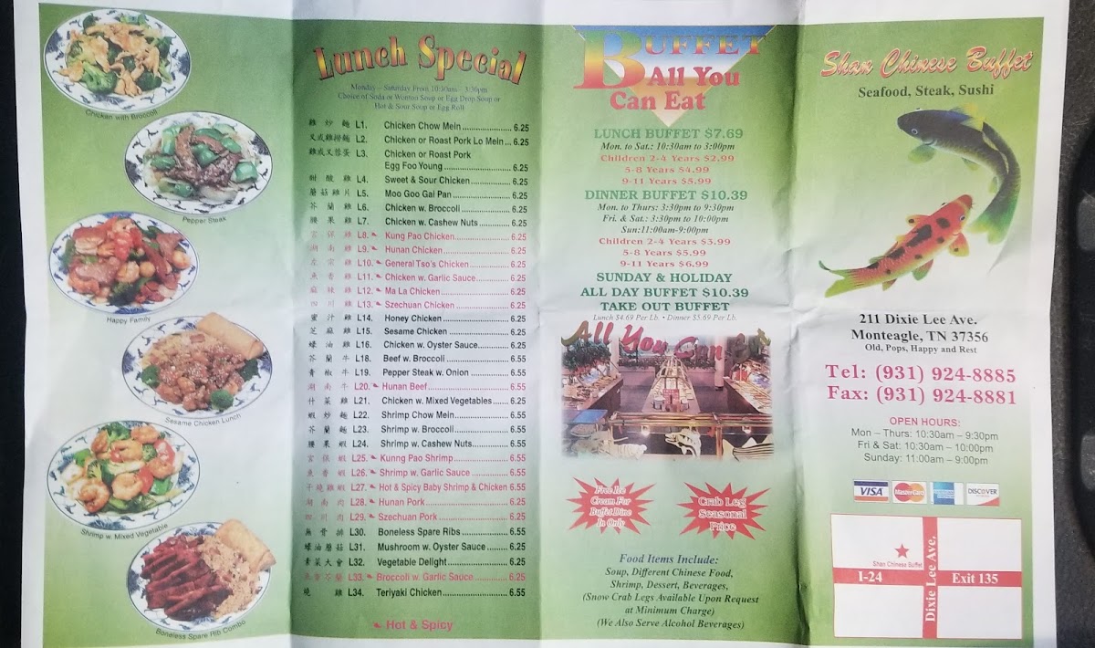 Welcome to Shan Chinese Buffet, a hidden gem located at 211 Dixie, Lee Hwy, Monteagle, TN. This charming establishment offers a delightful all-you-can-eat buffet for both lunch and dinner, featuring a vast array of authentic Chinese dishes.